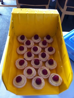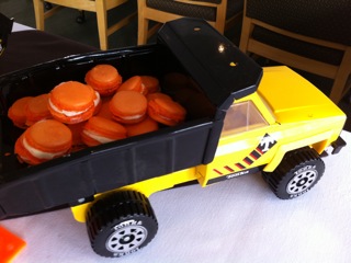 I made some desserts for an “Under Construction” Baby Shower. The theme colors were yellow, black and white. I made Chocolate Fudge Cake Pops, Lemon Tassies w/ Rasberries and Orange French Macarons. The original plan was to have an orange macaron tower representing a construction cone but I wasn’t able to do that. It would have been so darn cute! I’m sure I’ll try it some time. The desserts were displayed in toy construction equipment such as dump trucks and loaders. It was a really cute idea! Enjoy.